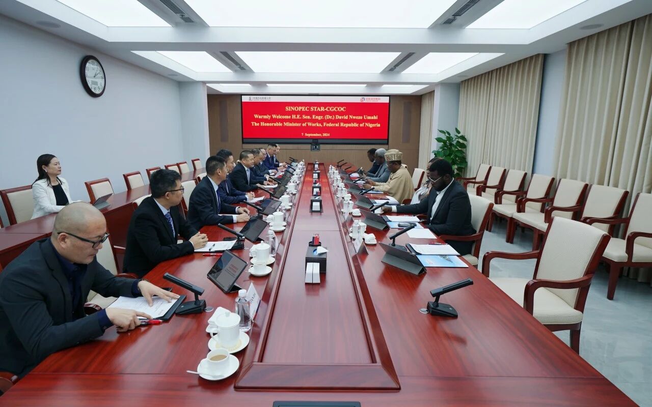 On September 7, Chairman Lan Meizhong met with Nigeria's Minister of Works, David Umahi, who was visiting China to attend the Forum on China-Africa Cooperation Summit alongside President Bola Tinubu. Zhou Ming, Deputy Chief Economist and Director of the Office (Foreign Affairs Office) of Sinopec Xinxing Petroleum Co., Ltd., Zhong Xiang, Managing Director of CGC Nigeria Limited, as well as heads of relevant departments and subsidiaries, were present throughout the meeting.