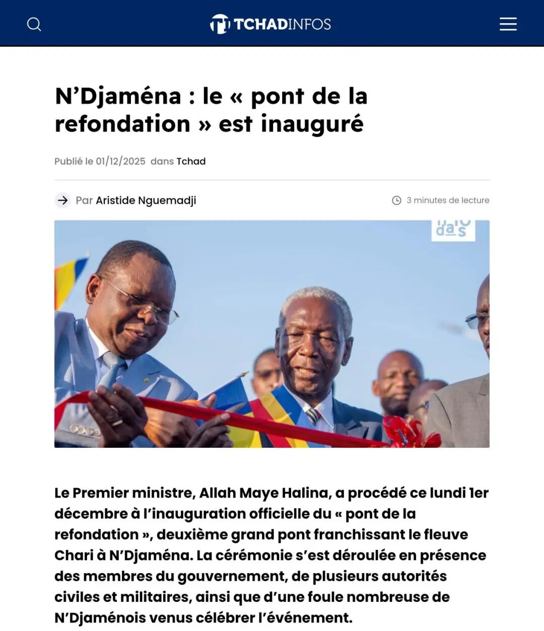 当地时间2025年12月1日,中地海外乍得公司承建的乍得首都恩贾梅纳夏瓜大桥竣工典礼在沙里河畔隆重举行。